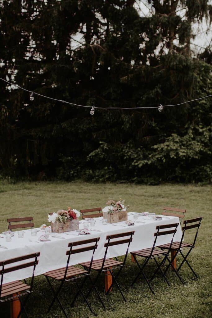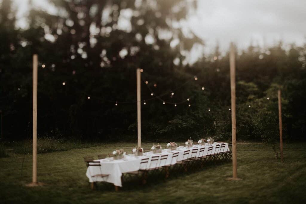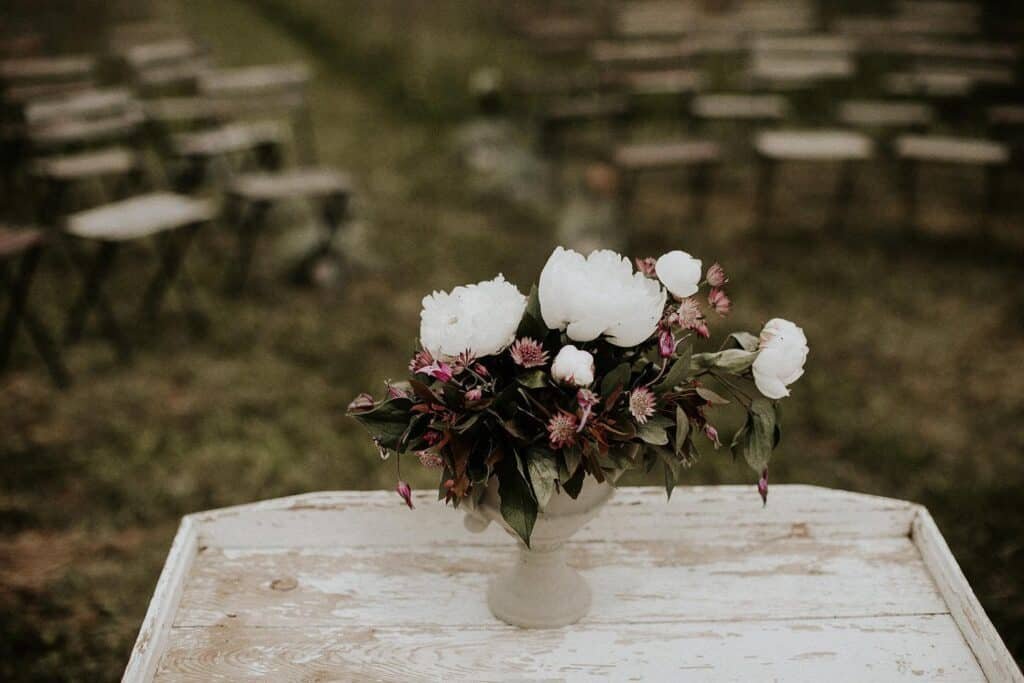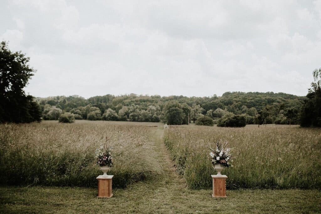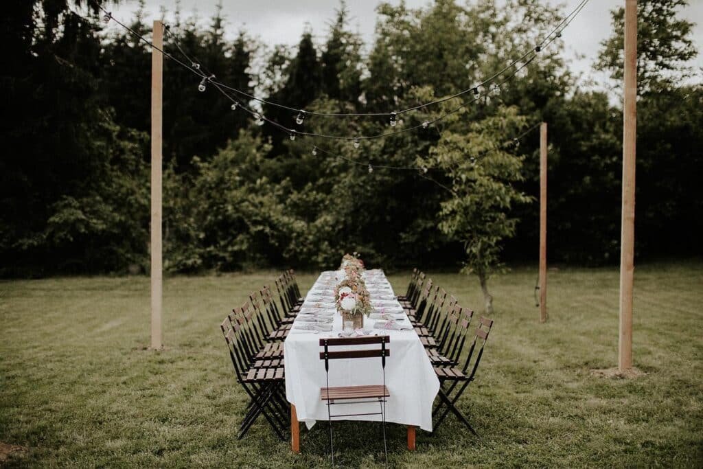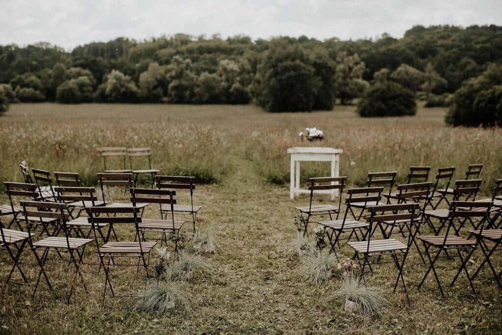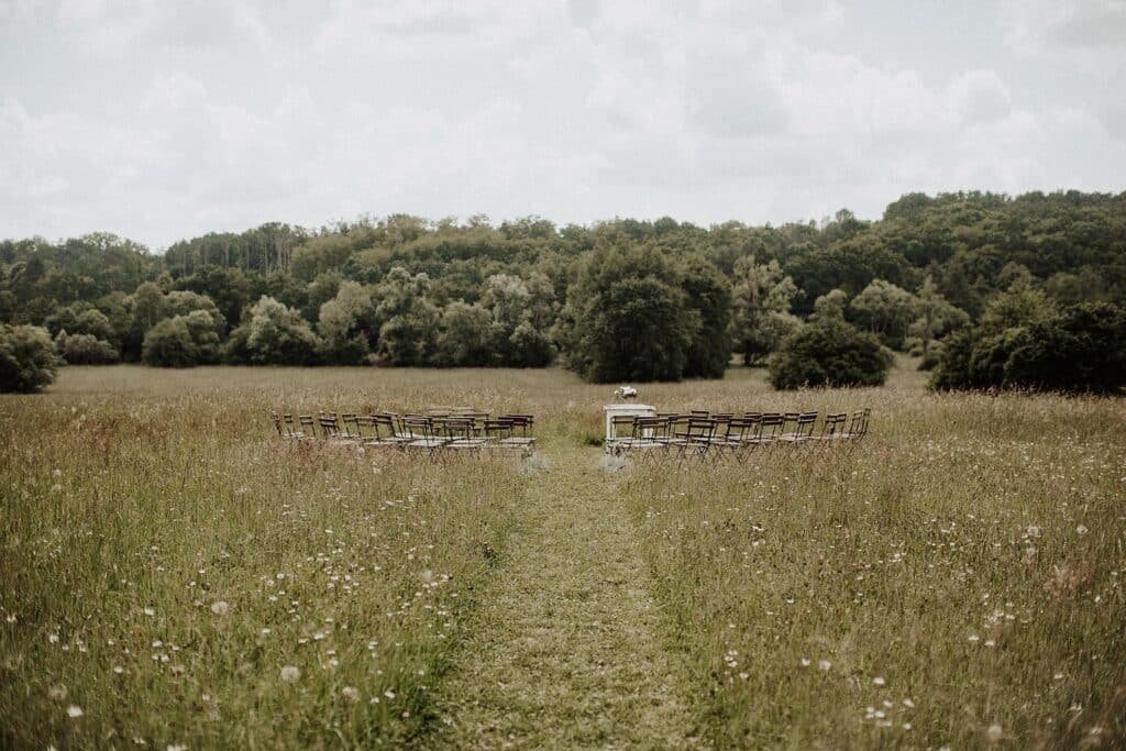 Polgári szertartásuk is volt, ez volt az egyik kedvenc részem a nagy napon. Lent a dombon volt a helyszínen, amit úgy alakított ki a pár, hogy sokáig hagyta, hogy nőjenek a vadvirágok, majd ebbe nyírtak egy kis ösvényt, aminek a végén volt egy kör, itt volt a szertartás és kör alakba helyezték ki a székeket is. Nagyon ötletes volt. 🙂