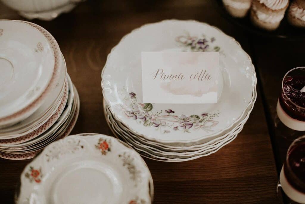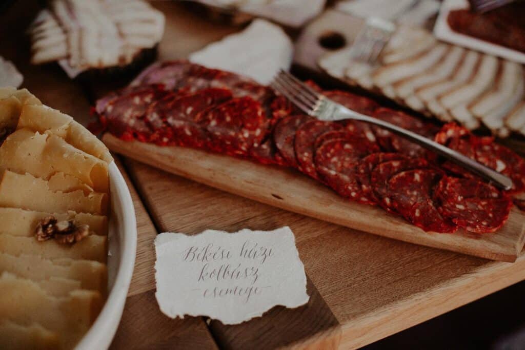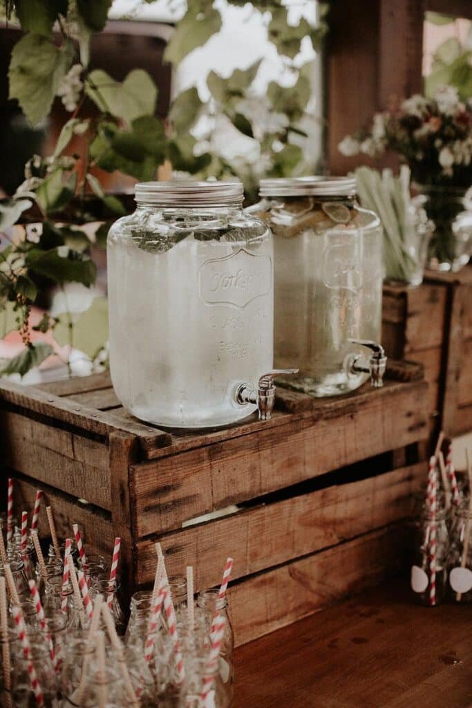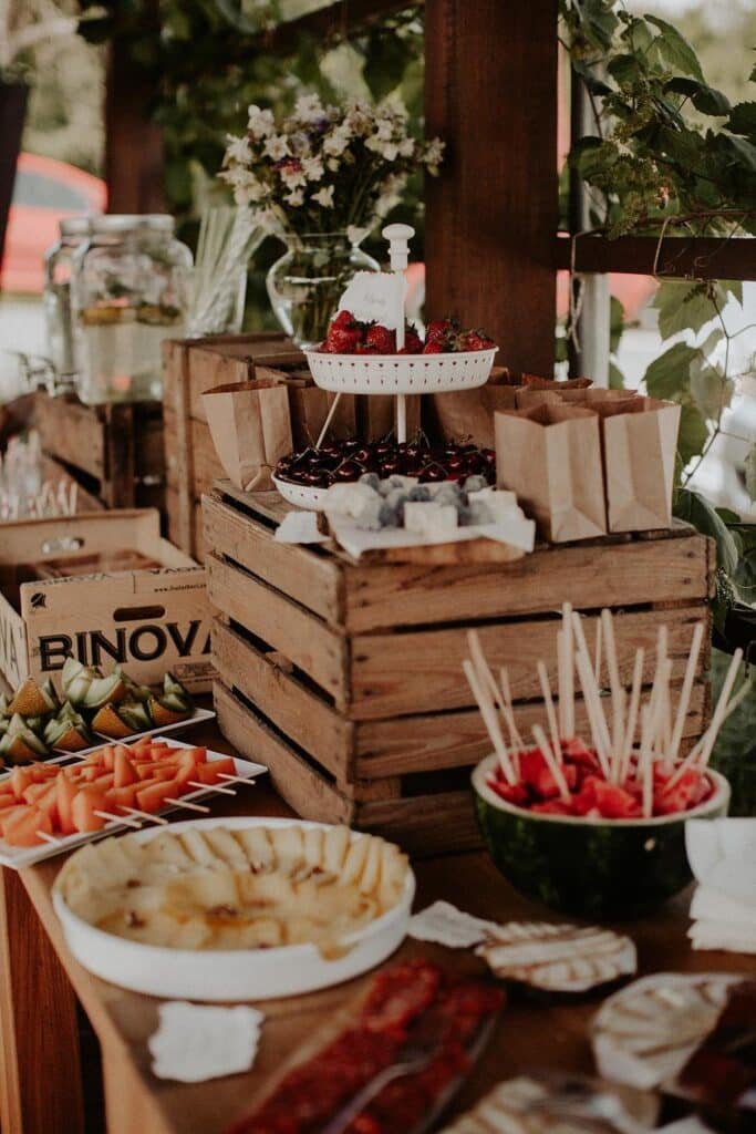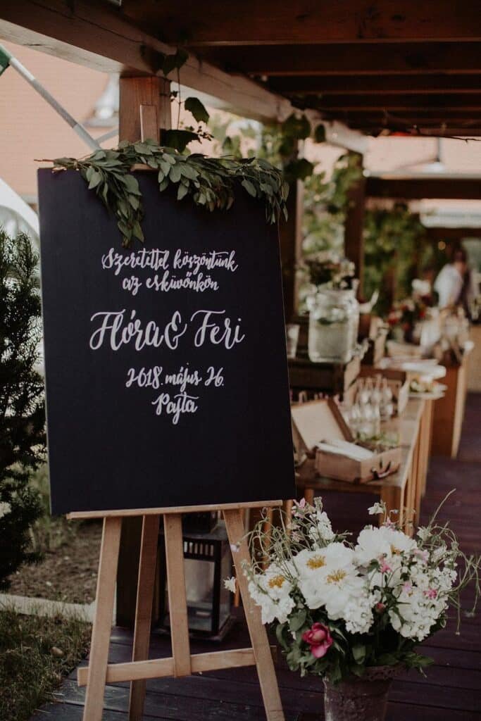 Kialakítottunk egy kis vendégváró részt a helyszínen, ahol fekete krétatáblára írtuk a köszöntőtáblát, mellette készítettünk limondébárt, illetve ehhez vittunk sok kis porcelántányért a welcome falatoknak. A kis ételkiírásokat tépett papírra készítettük el.