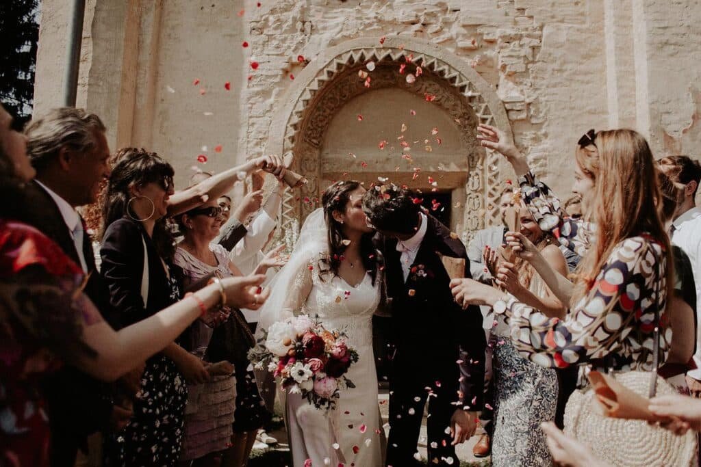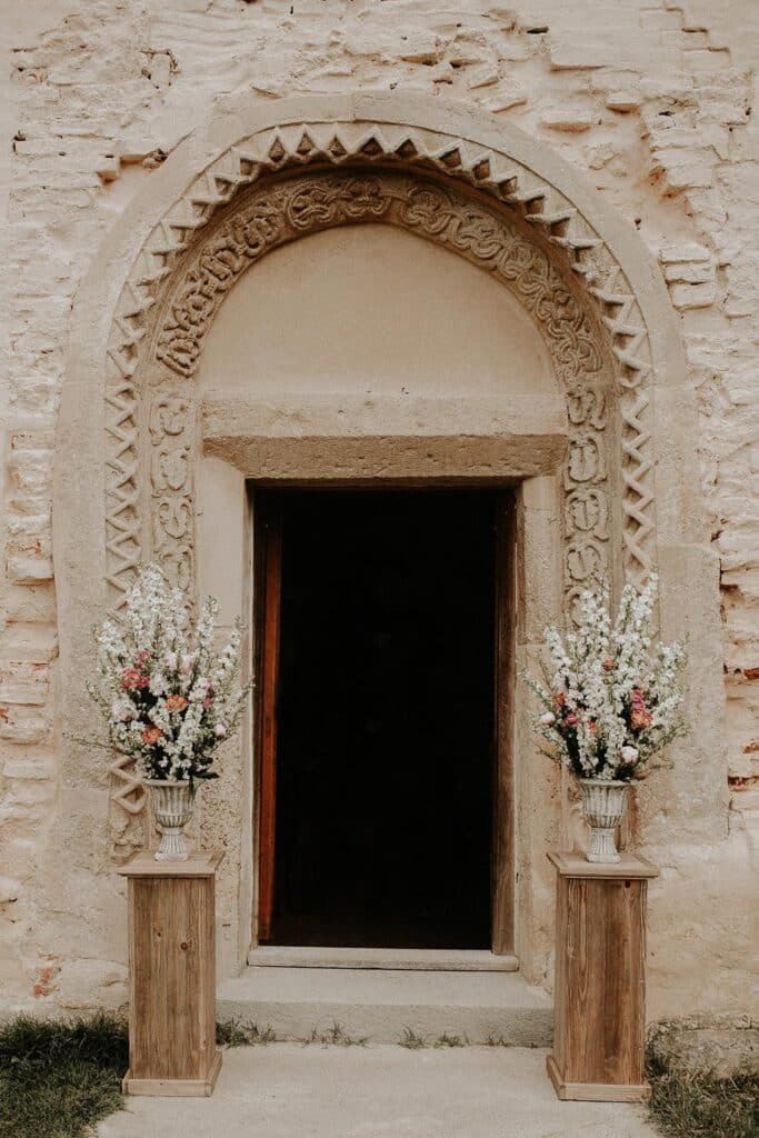 A régies templom kapujában csináltunk egy kis dekorációt, illetve szirommal is készültünk, hiszen a vendégek a párt kivonuláskor megszórták szirommal.