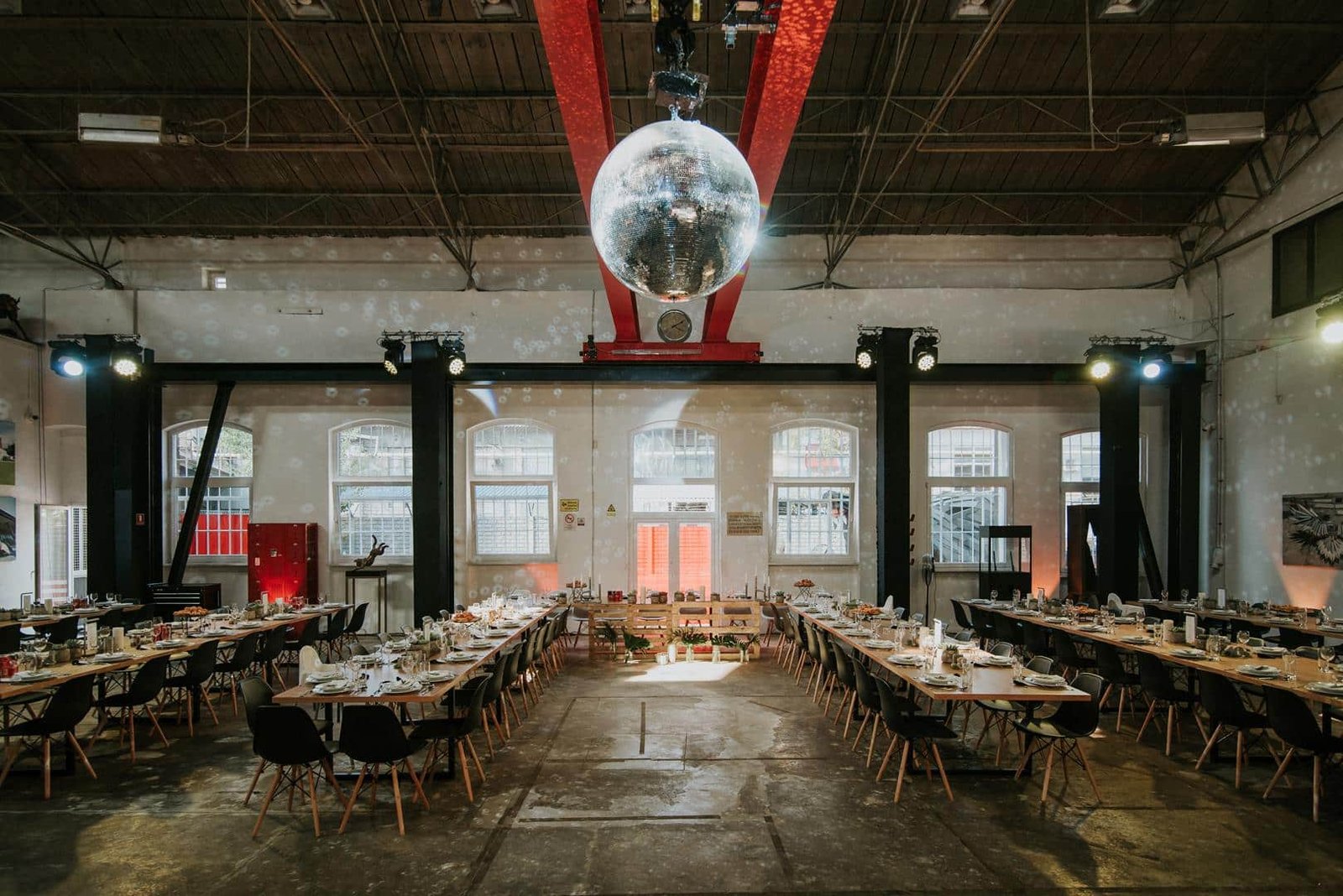 Ez a kombináció remekül mutatja, hogyan lehet az ipari és a természetes elemeket harmonikusan összehangolni egy loft esküvő dekorációjában.