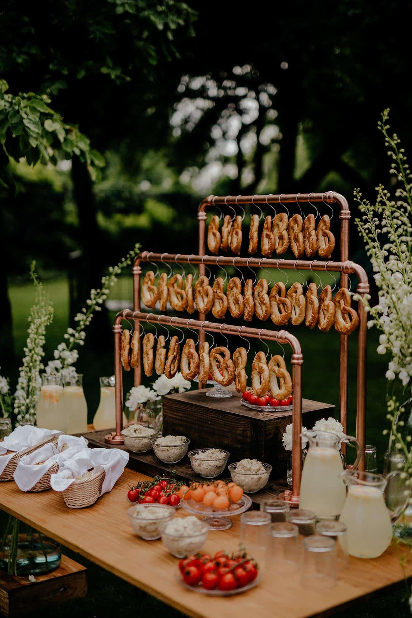 A részleteket tekintve készítettünk nekik egy perecbárt, ezt imádtam, ez volt a kedvencünk! A vendégvárásra helyeztük ki, amiket plusz kencékkel egészítettünk ki. Az esküvő fontos pillére volt a gasztronómia , így mindenképpen szerettünk volna valami nem hétköznapit alkotni.