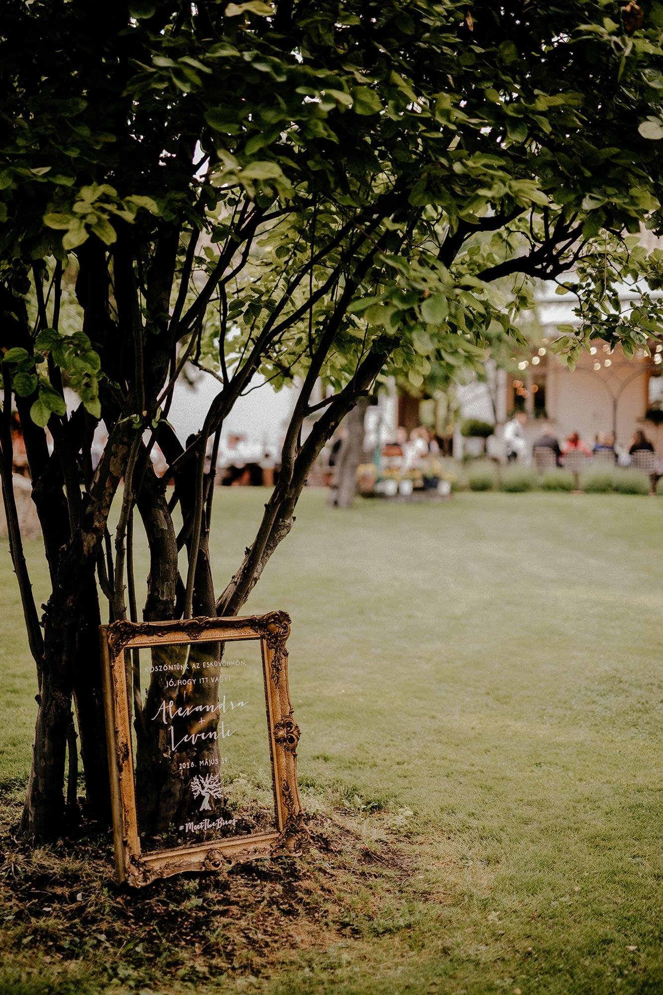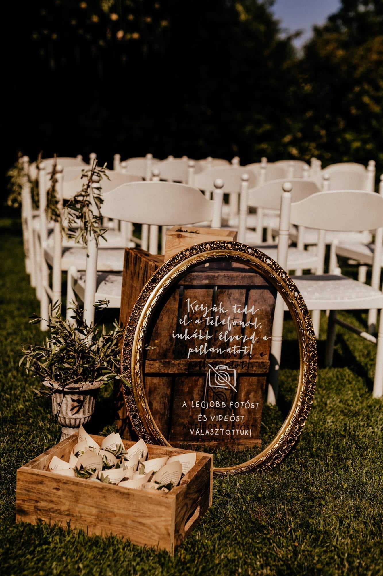 A köszöntőtáblát, illetve a szertartáshoz is a “Ne fotózz!” táblát plexiből csináltuk arany keretbe, ezt ennél az esküvőnél csináltuk ilyen formában először, újdonságnak számított.:)