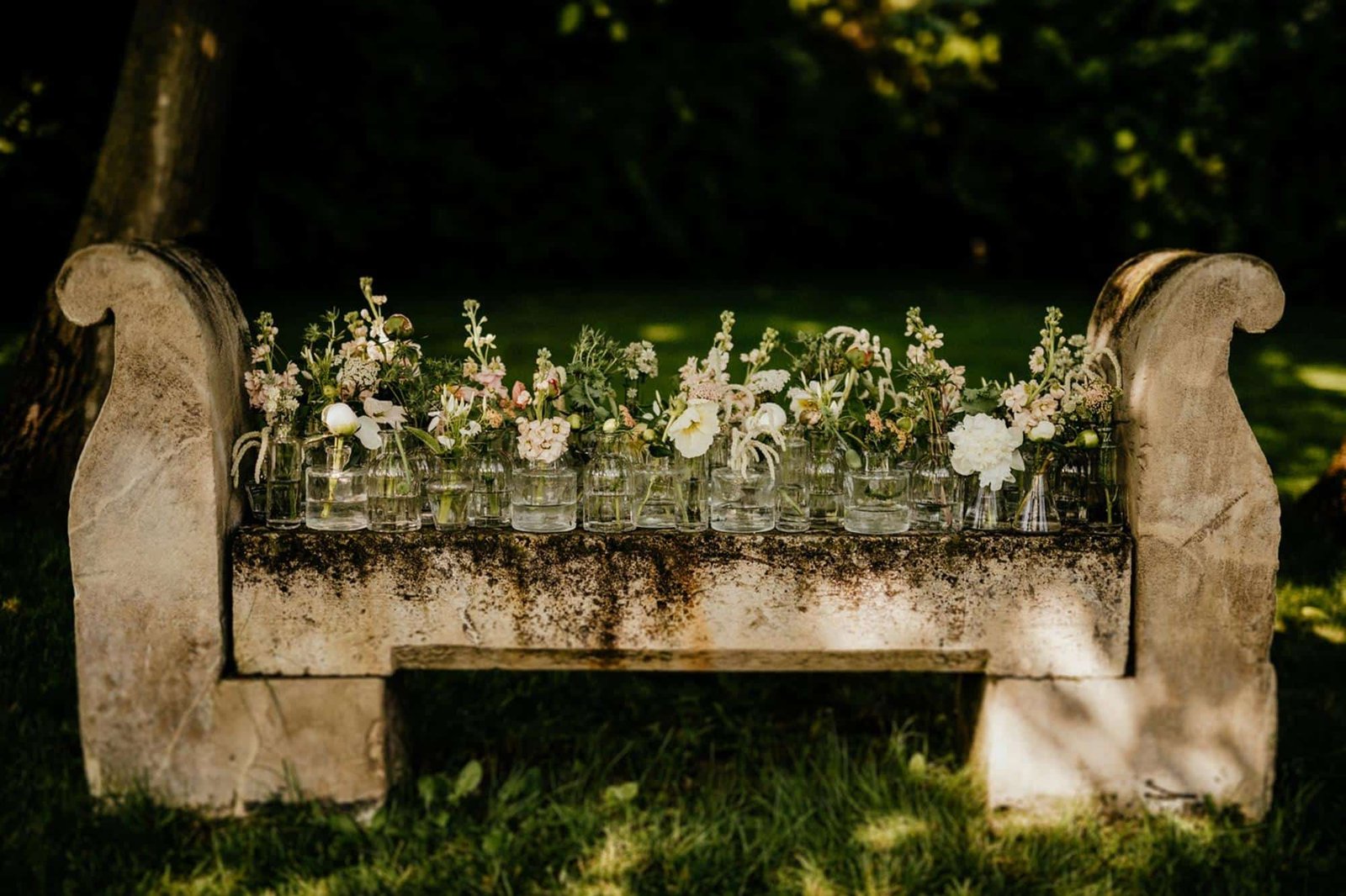 A szertartás dekorációnál egy kőpadra sok kicsi vázát tettünk, sok pici virággal, ez egy háttérnek is szolgált, térelemként szerepelt, illetve mögöttük virágok lógtak még egy fáról.